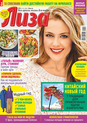 Самый популярный в России еженедельный журнал для молодых женщин «Лиза» стал еще интереснее, еще привлекательнее для читательниц. Теперь больше знаменитостей на страницах любимого журнала! Фитнес со звездой и звездный макияж, уроки стиля и самые горячие новости из жизни кумиров. А еще — модный шопинг, актуальная мода, новинки косметики и великолепные идеи для дома. Романтические истории о настоящей любви и рассказы читательниц о разных жизненных ситуациях. Аспекты психологии, секреты успешных отношений с окружающими и искусство сохранения любви.