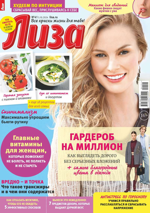 Самый популярный в России еженедельный журнал для молодых женщин «Лиза» стал еще интереснее, еще привлекательнее для читательниц. Теперь больше знаменитостей на страницах любимого журнала! Фитнес со звездой и звездный макияж, уроки стиля и самые горячие новости из жизни кумиров. А еще — модный шопинг, актуальная мода, новинки косметики и великолепные идеи для дома. Романтические истории о настоящей любви и рассказы читательниц о разных жизненных ситуациях. Аспекты психологии, секреты успешных отношений с окружающими и искусство сохранения любви.