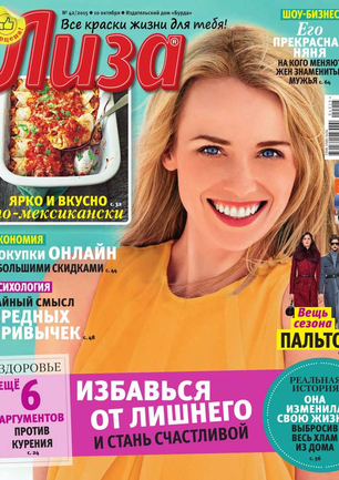 Самый популярный в России еженедельный журнал для молодых женщин «Лиза» стал еще интереснее, еще привлекательнее для читательниц. Теперь больше знаменитостей на страницах любимого журнала! Фитнес со звездой и звездный макияж, уроки стиля и самые горячие новости из жизни кумиров. А еще — модный шопинг, актуальная мода, новинки косметики и великолепные идеи для дома. Романтические истории о настоящей любви и рассказы читательниц о разных жизненных ситуациях. Аспекты психологии, секреты успешных отношений с окружающими и искусство сохранения любви.