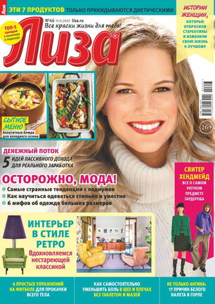 Самый популярный в России еженедельный журнал для молодых женщин «Лиза» стал еще интереснее, еще привлекательнее для читательниц. Теперь больше знаменитостей на страницах любимого журнала! Фитнес со звездой и звездный макияж, уроки стиля и самые горячие новости из жизни кумиров. А еще — модный шопинг, актуальная мода, новинки косметики и великолепные идеи для дома. Романтические истории о настоящей любви и рассказы читательниц о разных жизненных ситуациях. Аспекты психологии, секреты успешных отношений с окружающими и искусство сохранения любви.