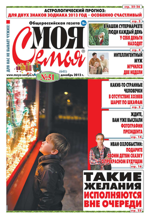 Общероссийская газета «Моя Семья» существует с 2000 года и входит в число самых популярных изданий России. Газета является не просто средством информации; для многих людей стало жизненной потребностью прочитать её раз в неделю – это сродни желанию увидеться с родственниками, поговорить с друзьями. Подавляющее большинство читателей не пропускает ни одного номера. «Моя Семья» задумана как газета о человеческих отношениях. Редакция делает упор на историях из жизни, и многие публикации представляют собой короткие рассказы. Главной основой газетных заметок являются письма читателей, что делает «Мою Семью» уникальной – все истории здесь подлинные.