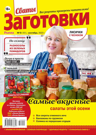 Более 100 рецептов заготовок от Сватов в каждом номере: соленья и маринады, салаты и ассорти, соусы и приправы, заготовки к сезону, сладкие заготовки, напитки, винный погребок, мясные деликатесы, здоровые рецепты, целебные заготовки, дачные хлопоты, правила хранения, а также кроссворды и сканворды для досуга. Лучшими рецептами поделятся с вами сваты Любовь Сергеевна и Михаил Михайлович.