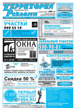 Газета «Территория рекламы» представляет собой рекламно-информационное издание, ориентированное на читателей и рекламодателей Домодедовского и Ленинского районов Московской области.