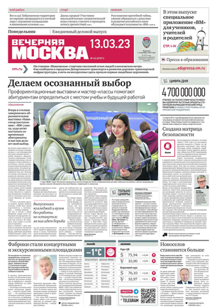 «Вечерняя Москва» — ежедневная российская вечерняя газета, старейшее из вечерних изданий в России, учрежденное в 1923 году. Выходит пять дней в неделю, кроме субботы и воскресенья. Отличается тем, что рассказывает о событиях еще не завершившегося дня. Оперативно освещает хронику и особенности жизни Москвы, охватывает все слои общества и большинство профессиональных и возрастных групп читателей.Издание представлено тремя выпусками – утренним ежедневным, вечерним (выходит три раза в неделю), еженедельным (выходит по четвергам).