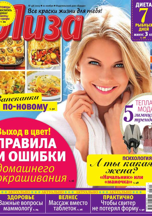 Самый популярный в России еженедельный журнал для молодых женщин «Лиза» стал еще интереснее, еще привлекательнее для читательниц. Теперь больше знаменитостей на страницах любимого журнала! Фитнес со звездой и звездный макияж, уроки стиля и самые горячие новости из жизни кумиров. А еще — модный шопинг, актуальная мода, новинки косметики и великолепные идеи для дома. Романтические истории о настоящей любви и рассказы читательниц о разных жизненных ситуациях. Аспекты психологии, секреты успешных отношений с окружающими и искусство сохранения любви.