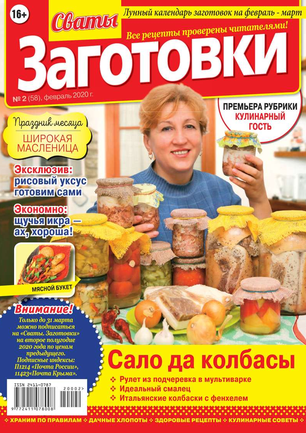 Более 100 рецептов заготовок от Сватов в каждом номере: соленья и маринады, салаты и ассорти, соусы и приправы, заготовки к сезону, сладкие заготовки, напитки, винный погребок, мясные деликатесы, здоровые рецепты, целебные заготовки, дачные хлопоты, правила хранения, а также кроссворды и сканворды для досуга. Лучшими рецептами поделятся с вами сваты Любовь Сергеевна и Михаил Михайлович.