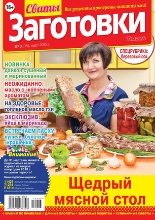 Более 100 рецептов заготовок от Сватов в каждом номере: соленья и маринады, салаты и ассорти, соусы и приправы, заготовки к сезону, сладкие заготовки, напитки, винный погребок, мясные деликатесы, здоровые рецепты, целебные заготовки, дачные хлопоты, правила хранения, а также кроссворды и сканворды для досуга. Лучшими рецептами поделятся с вами сваты Любовь Сергеевна и Михаил Михайлович.