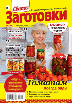 Более 100 рецептов заготовок от Сватов в каждом номере: соленья и маринады, салаты и ассорти, соусы и приправы, заготовки к сезону, сладкие заготовки, напитки, винный погребок, мясные деликатесы, здоровые рецепты, целебные заготовки, дачные хлопоты, правила хранения, а также кроссворды и сканворды для досуга. Лучшими рецептами поделятся с вами сваты Любовь Сергеевна и Михаил Михайлович.