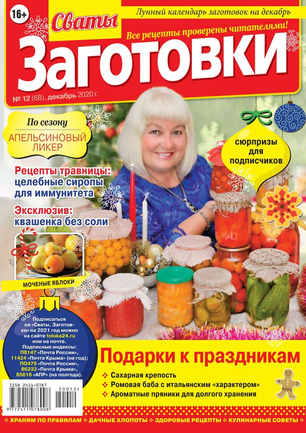 Более 100 рецептов заготовок от Сватов в каждом номере: соленья и маринады, салаты и ассорти, соусы и приправы, заготовки к сезону, сладкие заготовки, напитки, винный погребок, мясные деликатесы, здоровые рецепты, целебные заготовки, дачные хлопоты, правила хранения, а также кроссворды и сканворды для досуга. Лучшими рецептами поделятся с вами сваты Любовь Сергеевна и Михаил Михайлович.