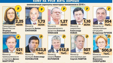 Дело, видимо, в том, что сознание слуг народа определяет совсем другое бытие. По данным Минфина, которые привёл РБК, зарплата Антона Силуанова, главы ведомства, превысила среднюю по стране в 47 раз и составила 1 млн 730 тыс. руб. в месяц. Главы Минэкономразвития Алексей Улюкаев (которого в течение всего 2017 г. судили за взятку и в итоге приговорили к 8 годам колонии) и Максим Орешкин в 2016 г. получали по 1 млн 220 тыс. руб. (в 33 раза больше среднего). Среди тех, чьи доходы были раскрыты (не опубликованы зарплаты министров силового блока и президента), больше всего порадовала своими успехами глава Центробанка Эльвира Набиуллина - её заработок превысил средний по стране в 61 раз и составил 2 млн 250 тыс. руб. Самыми скромными оказались зарплаты членов Совета Федерации - 385 тыс. руб. в месяц, или всего в 10,5 раза выше средней по России. А вот средняя зарплата всех федеральных чиновников составила в 2016 г. «всего» 116 тыс. руб. - следует из данных Росстата.